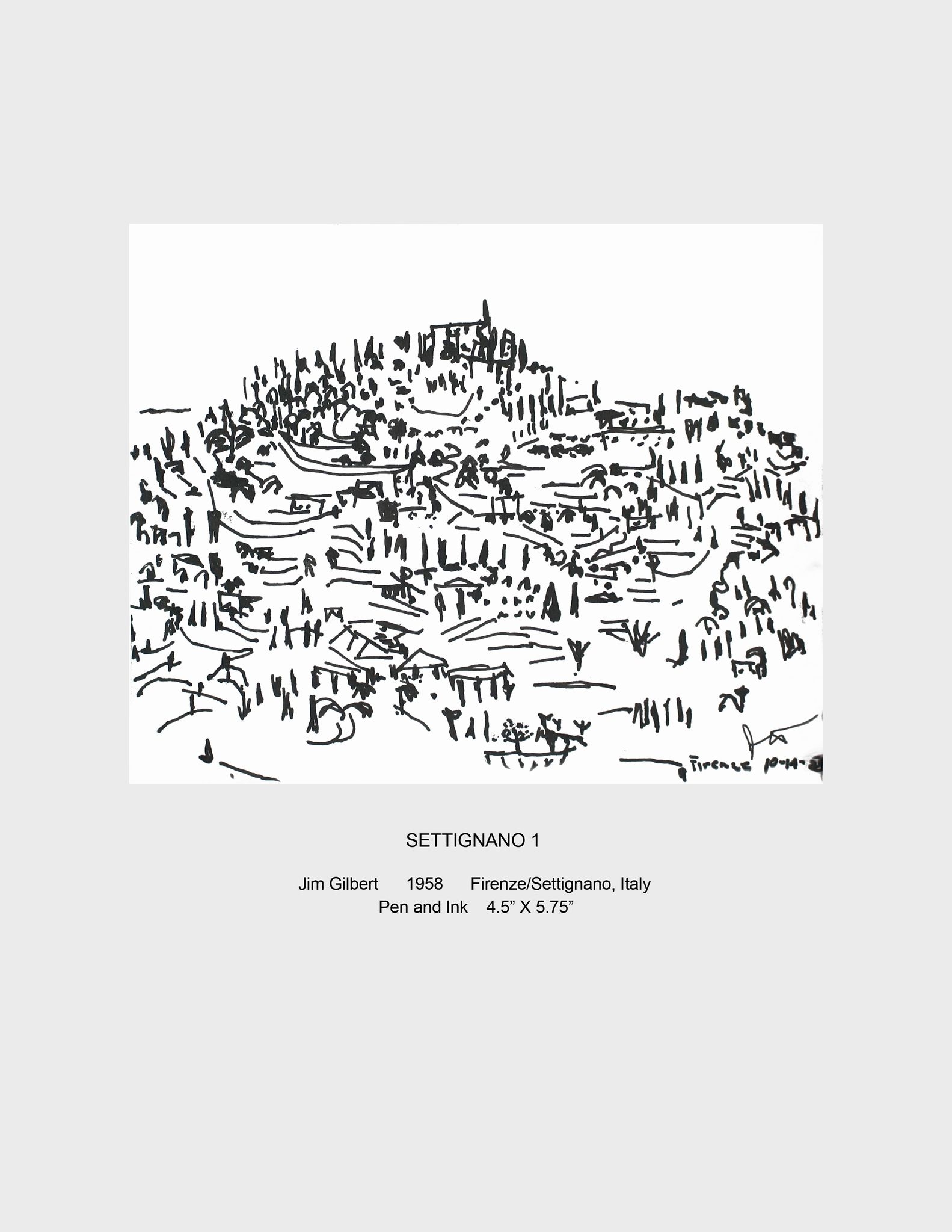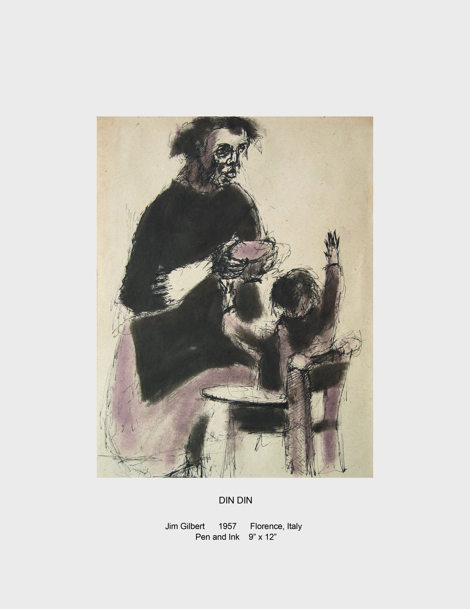 I produced a great many pen and ink drawings from 1956-59 when I lived in Perugia, Florence and Settignano, Italy; Berlin, Germany, and Vienna, Austria. This time was devoted to working with subjects that existed in the objective world including landscapes, musicians, the circus, friends, street life, and my family. Many of the drawings from this period were done on 16-18th century paper.